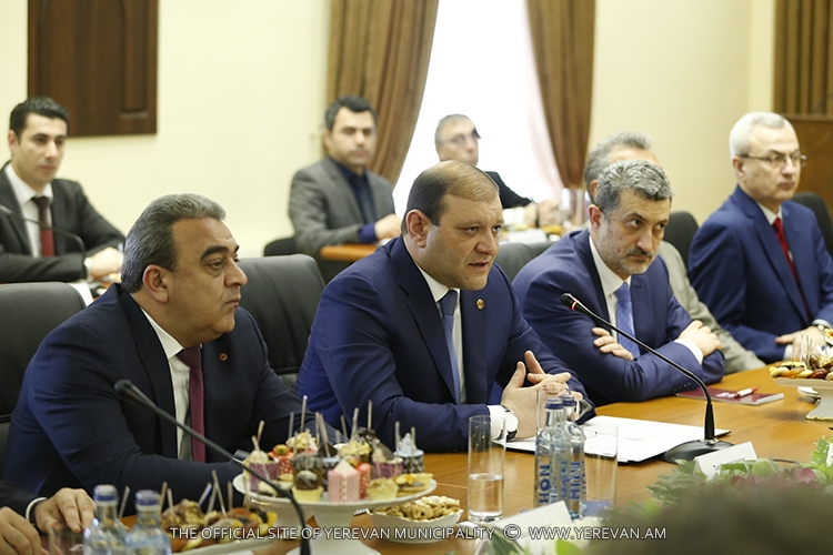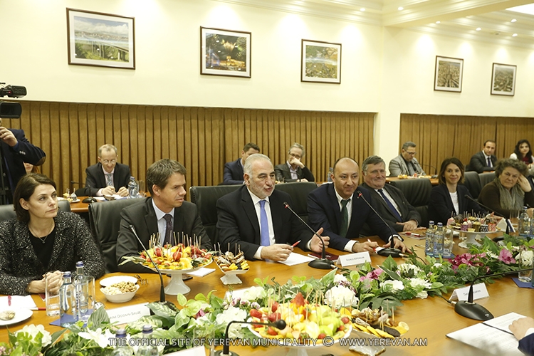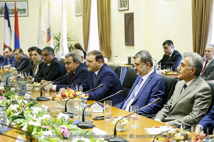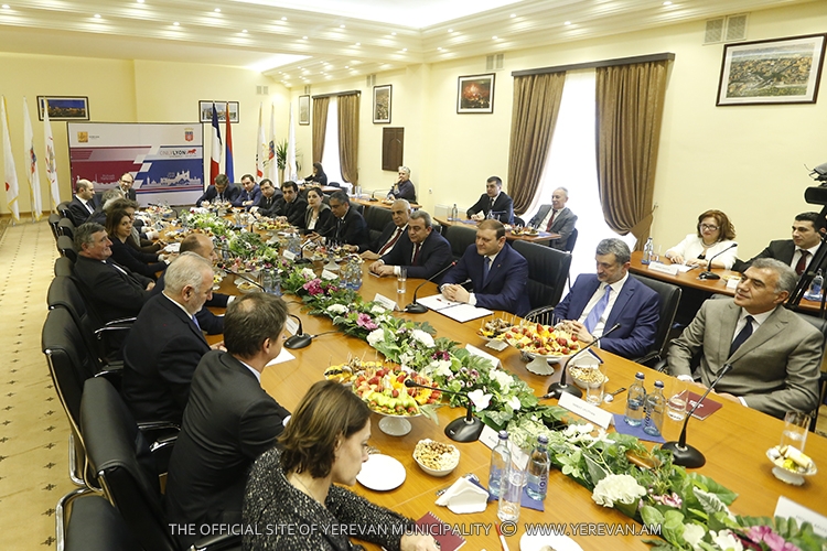 Greeting the guests during the official meeting Mayor Taron Margaryan stressed that strengthening the friendly and partners ties between Yerevan and Lyon, working out bilateral programs and cooperation in various spheres are really important for Yerevan.
