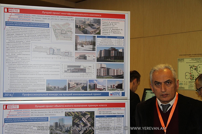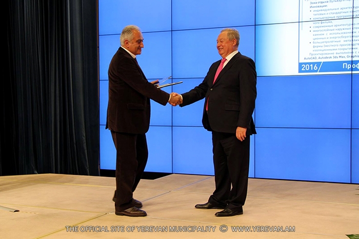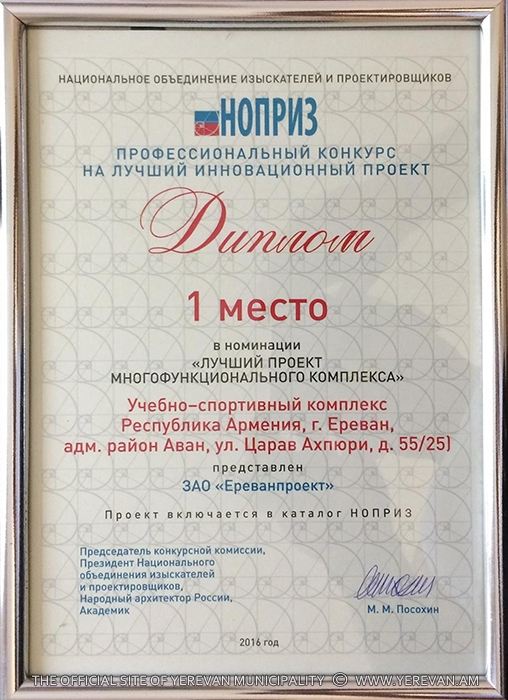 Yerevan Municipality CJSC “Yerevanproject” took part in the competition with the design of the educational and sport complex located at Tsarav Aghbyur. The presented design got the 1st prize in the nominations “Best design of multi0functional complex” and “Best design of educational establishment”. The prizes and diplomas were handed to the representative of CJSC “Yerevanaproject” by the chairman of the competition commission, the president of the National union of prospectors and designers, the director of “Mosproject 2” institute, People's Architect of Russia Mikhail Posokhin.