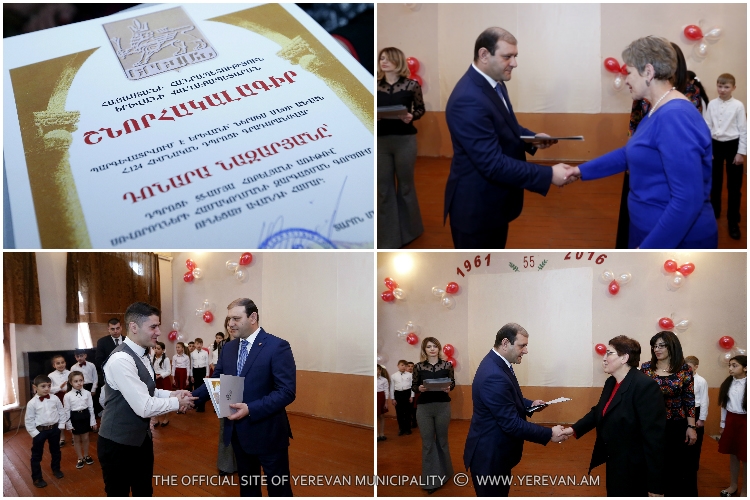 On the occasion of the 55th anniversary of foundation, for success in patriotic upbringing of schoolchildren and for significant contribution to the sphere of education the director of the school N 124 after Nerses Mets Naira Martirosyan was awarded with memory medal “Honorary teacher of Yerevan”. A number of employees of the school were awarded with honorary and thanksgiving diplomas.