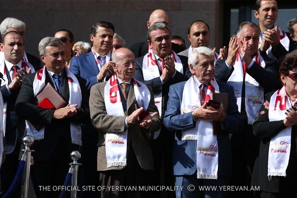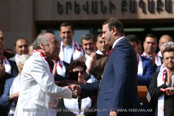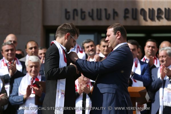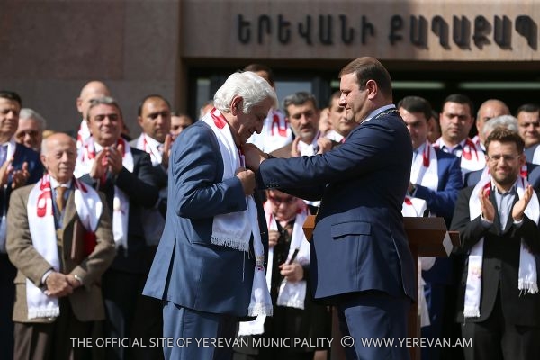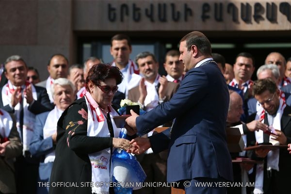 During the solemn ceremony taken place in the square adjacent to the Municipality of Yerevan, within the frames of the festive events dedicated to «Erebuni-Yerevan», following the decision of the Council of Elders of Yerevan made on October 8, the Mayor of Yerevan Taron Margaryan in accordance with the protocole awarded the title of Honorary Citizen of Yerevan to eminent violinist, the art director of the string quartet after Komitas, professor Eduard Tadevosyan, to the writer, publicist Meruzhan Ter-Gulanyan, to the chess player, international grand master Levon Aronyan and to professor, ecologist Karine Danielyan. Congratulating them and handing them the certificates Taron Margaryan expressed confidence that they will go on working with the same devotion and love for the sake of Yerevan's development.