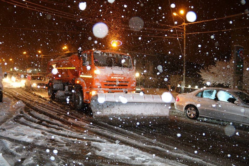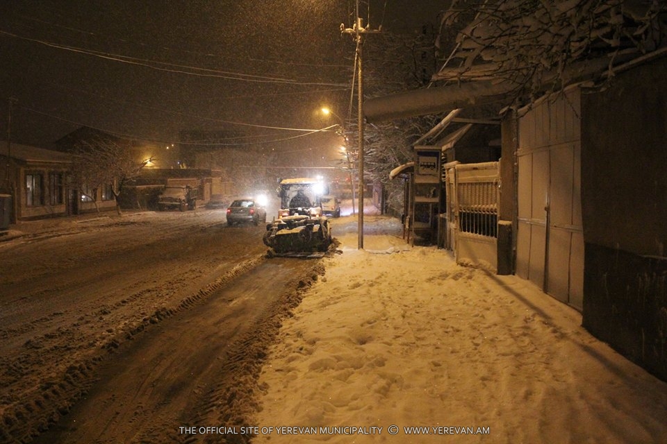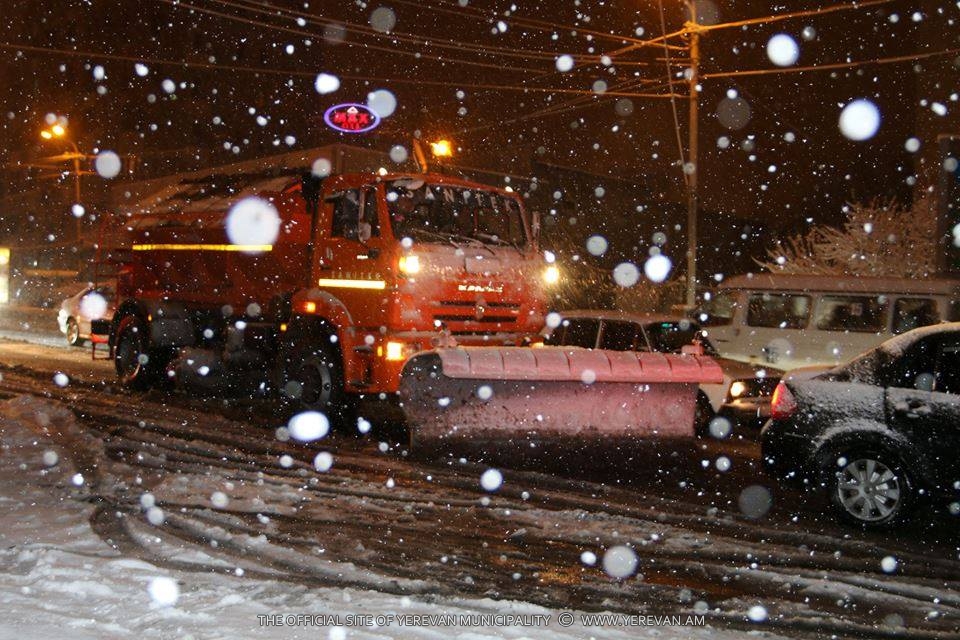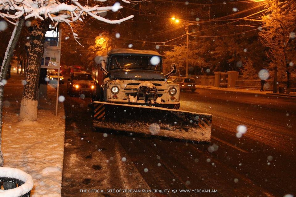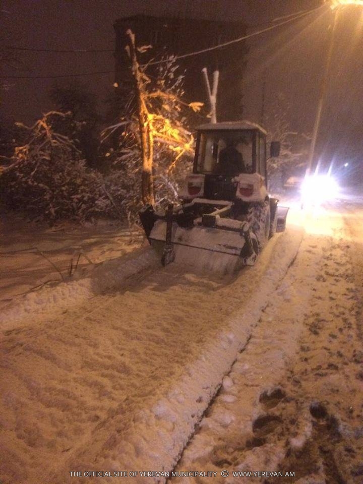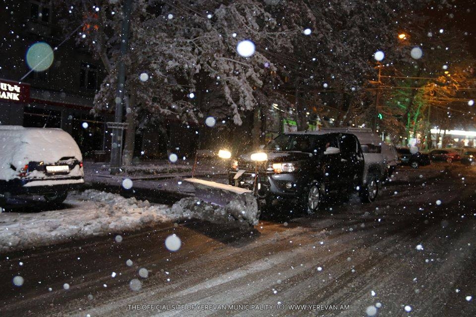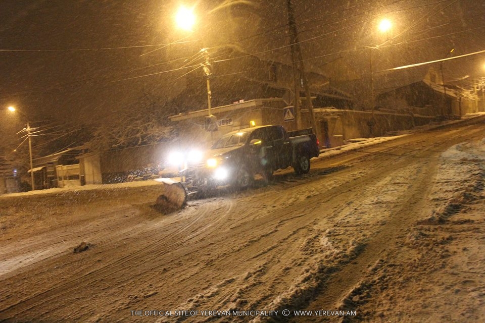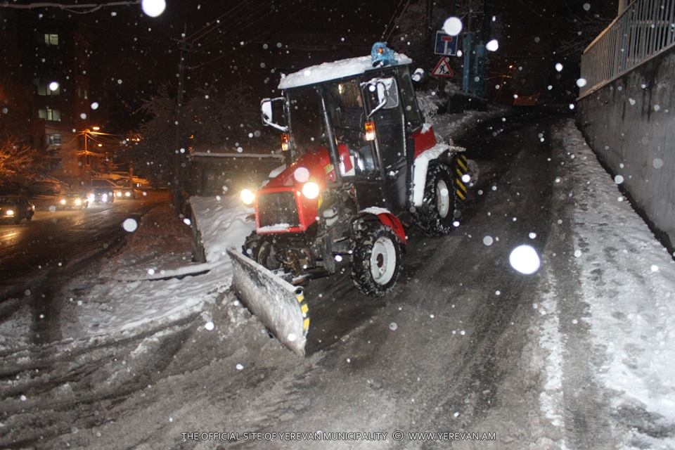 Մայրաքաղաքում, չդադարող ձյան տեղումներին զուգահեռ, շարունակվում են ձնամաքրման աշխատանքները: Հաշվի առնելով հատկապես գիշերային ժամերին սպասվող ջերմաստիճանի անկումը` հնարավոր մերկասառույցի առաջացումը կանխելու նպատակով գլխավոր և երկրորդական փողոցներում իրականացվում են նաև աղի և շլաքային ավազի խառնուրդով մշակման աշխատանքներ, որոնք կշարունակվեն ողջ գիշերվա ընթացքում: Աշխատանքներ են տարվում նաև մայթերի, բակերի և միջբակային աստիճանահարթակների մաքրման ուղղությամբ:
