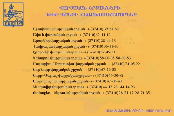 Աշխատանքային օրերին ժամը 09։00-ից 18։00-ը վարչական շրջանների ղեկավարների աշխատակազմերին ևս կարող եք ուղղել ձեզ հուզող հարցերը՝ զանգահարելով թեժ գծերի հետևյալ հեռախոսահամարներով: