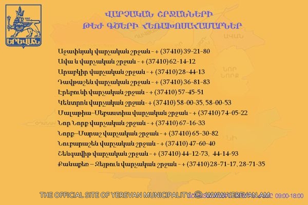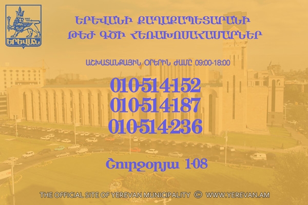 Ըստ այդմ, յուրաքանչյուր աշխատանքային օր, առանց ընդմիջման, ժամը 09։00-18։00, կարող եք զանգահարել Երևանի քաղաքապետարանի 010-514-152, 010-514-187, 010-514-236 հեռախոսահամարներով:
