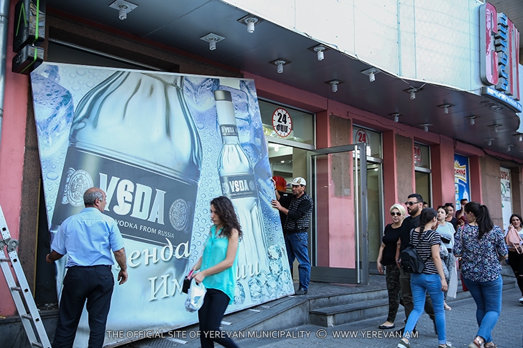 Դեռևս օգոստոս ամսին Երևանի քաղաքապետարանը համապատասխան ընթացակարգով վարչական վարույթներ էր իրականացրել, որոնց նպատակը պատմամշակութային արժեք ներկայացնող շենքերին առկա տարատեսակ գովազդների կանոնակարգումն էր: Մասնավորապես, այդ նպատակով կազմվել էին գովազդային անձնագրեր, որտեղ մանրամասն նշված էր, թե ինչ տեսք պետք է ունենան գովազդները, որպեսզի չխաթարեն այդ շենքերի ճարտարապետական դիմագիծը: Այդ մասին իրազեկվել են տնտեսվարող սուբյեկտները: Ըստ այդմ, Երևանի քաղաքապետի համապատասխան որոշմամբ, սեպտեմբերի 11-ին մայրաքաղաքի Տիգրան Մեծ պողոտայից մեկնարկել են գովազդային անձնագրերին չհամապատասխանող գովազդային ցուցանակների ապամոնտաժման աշխատանքները: Ընդ որում, Տիգրան Մեծ պողոտայում առկա 60 պատմամշակութային շենքերի գերակշիռ մասը գտնվում է Հանրապետության հրապարակից մինչև Խանջյան փողոցն ընկած հատվածում: