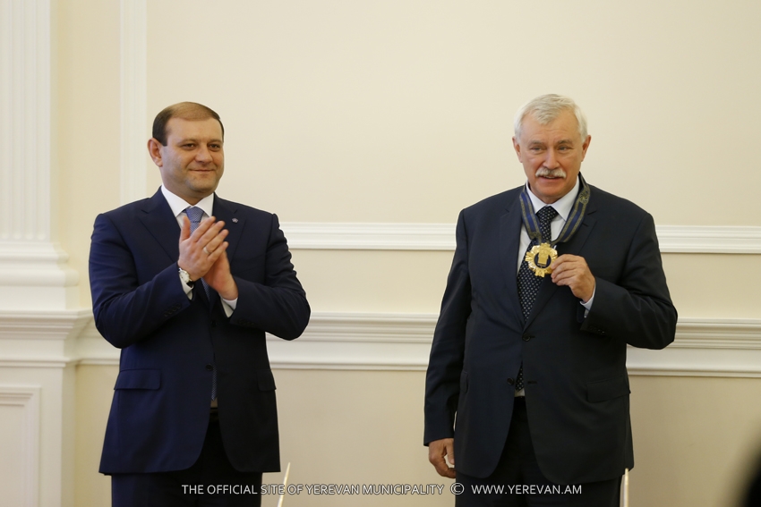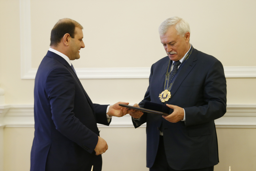 ՀՀ մայրաքաղաք Երևանի և ՌԴ հյուսիսային մայրաքաղաք Սանկտ Պետերբուրգի միջև սերտ համագործակցության և փոխադարձ կապերի ամրապնդման գործում ներդրած նշանակալի ավանդի համար Երևանի քաղաքապետ Տարոն Մարգարյանը Սանկտ Պետերբուրգի նահանգապետ Գեորգի Պոլտավչենկոյին պարգևատրել է «Արգիշտի առաջին» հուշամեդալով: