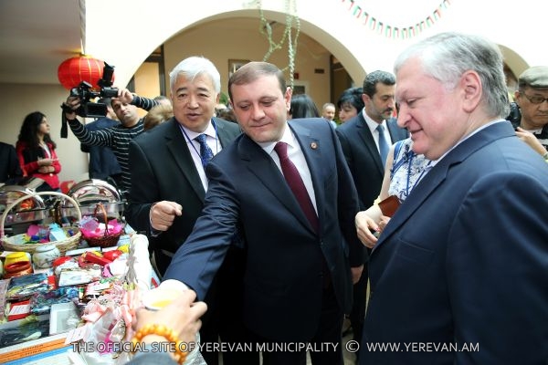 Мэр Тарон Маргарян в сопровождении временного исполнителя обязанностей министра иностранных дел Едварда Налбандяна, заместителя председателя НС РА Эрмине Нагдалян и других гостей ознакомился с выставкой, сделал покупки.